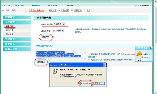 點擊“獲取代碼”按鈕,得到代碼,點擊“復制代碼”,選“允許訪問”,就把獲取的代碼復制好了,這時只要再粘貼“到網(wǎng)站的相關(guān)頁面的 </html> 的前一行”即可。