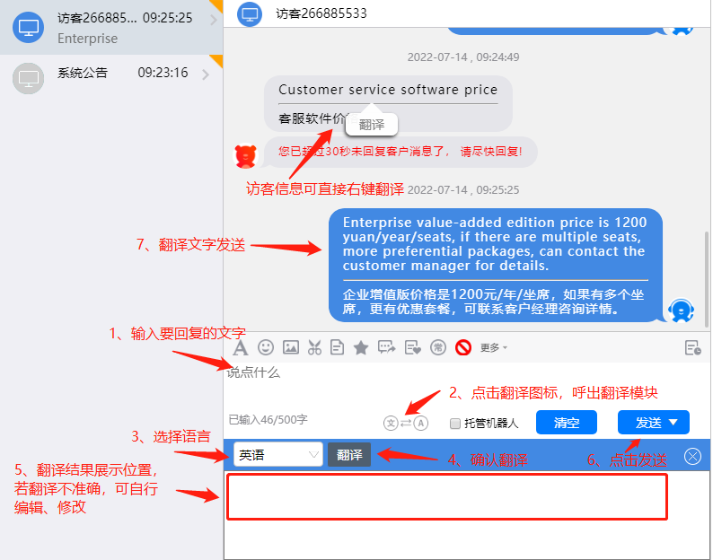 在接待不同語言的訪客時(shí),可將訪客消息及發(fā)送文字翻譯為指定語言,目前支持英、法、日、韓、俄等語言。